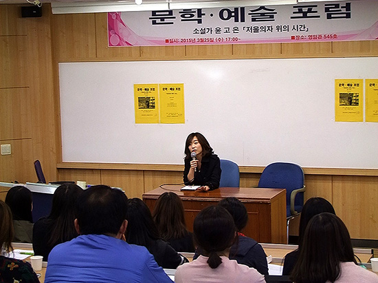 ‘제90회 문학예술포럼’이 지난 2월 25일 영암관 545호 강의실에서 열렸다. 이번 포럼은 ‘무중력 증후군’, ‘알로하’ 등의 소설을 창작한 윤고은 소설가가 강연자로 초청됐다. 포럼은 윤고은 소설가에 대한 소개, 강연, 질의 응답 순서로 진행됐다.