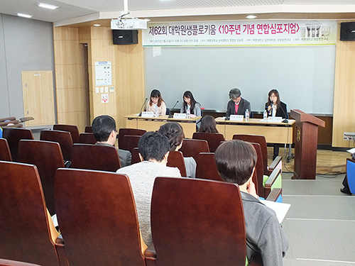 제62회 대학원생 콜로키움이 지난 3월 25일 영암관 들메실에서 열렸다. 이번 콜로키움은 우리학교, 경북대, 영남대 대학원생이 참여해 ‘여성의 멜랑콜리 시 의식이 구현하는 언술구조 연구’ 등의 주제로 발표 및 토론을 진행했다.