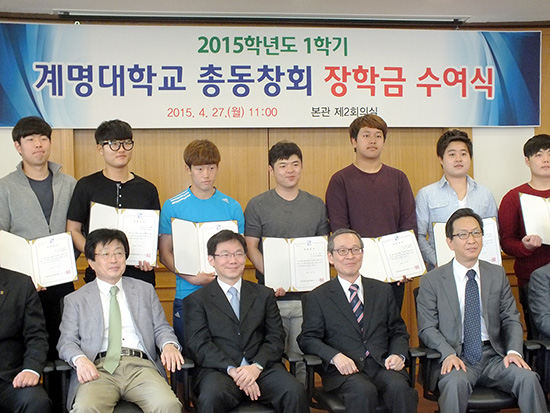 지난 4월 27일 ‘2015학년 1학기 총동창회 장학금 수여식’이 성서캠 본관 제2회의실에서 진행됐다. 이번 수여식에는 이병찬(경영학·교수) 총동창회장, 신진기(교통공학·교수) 경영부총장, 이중희(회계학·교수) 교학부총장 등의 교수 및 교직원이 참가했으며, 신명훈(체육학·4) 씨 외 10명의 학생에게 장학금을 수여했다.
