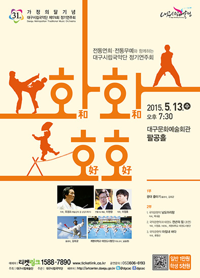 전통연희와 전통무예가 곁들여진 무대로 남녀노소가 즐길 수 있는 공연 ‘화화호호’가 오는 5월 13일 대구문화예술회관에서 열린다. 1부에서는 인간문화재 김대균의 광대줄타기가 펼쳐지고 2부에서는 대구시립국악단의 웅장한 국악관현악과 태권도가 함께 꾸미는 무대인 ‘천년의 힘’이 초연된다.
