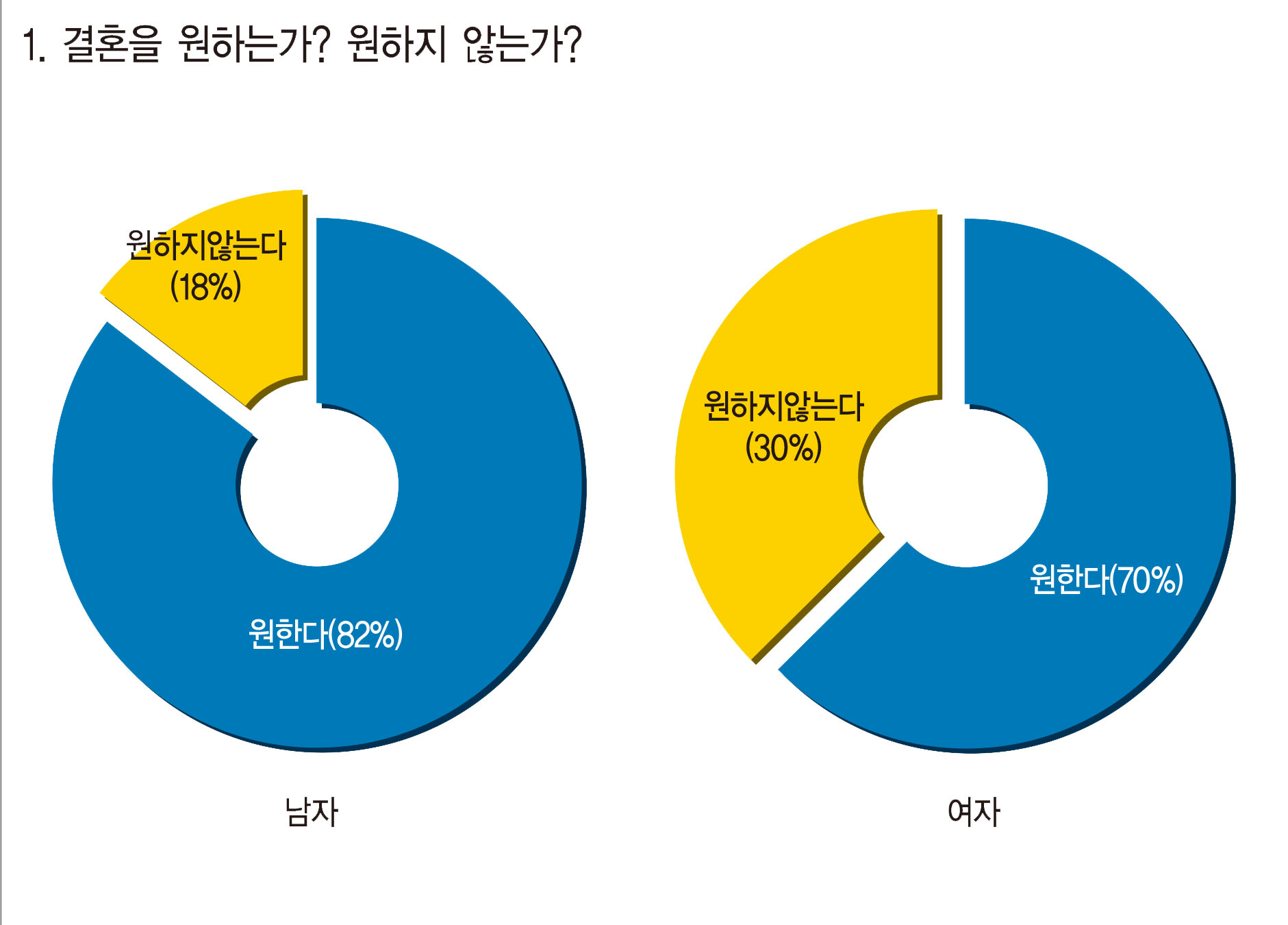 계명인 100명(남자 50명, 여자 50명)을 대상으로 ‘결혼을 원하는가? 원하지 않는가?’에 대한 무작위 설문조사를 해보았다. 이들 가운데 결혼을 원한다고 답한 사람은 76명(남자 41명, 여자 35명)이다. 결혼을 원하는 사람들 중 그 이유를 물어봤을 때 ‘내 가정을 꾸리고 싶어서’라는 답변이 남자 약 51%(21명), 여자 약 42%(15명)로 가장 높은 비율을 차지했다. 이들은 아이를 갖고 싶어 하는 사람, 배우자를 맞이하고 싶어 하는 사람들이 대다수인 것으로 나타났다. 다음으로 ‘삶의 행복을 위한 필수요소라고 생각해서’라는 답변의 비율이 여자 40%(14명), 남자 약 9%(4명)으로 2위를 차지했고 ‘외롭지 않은 인생을 살고 싶어서’가 여자 약 17%(6명), 남자 약 7%(3명)로 3위를 차지했다.