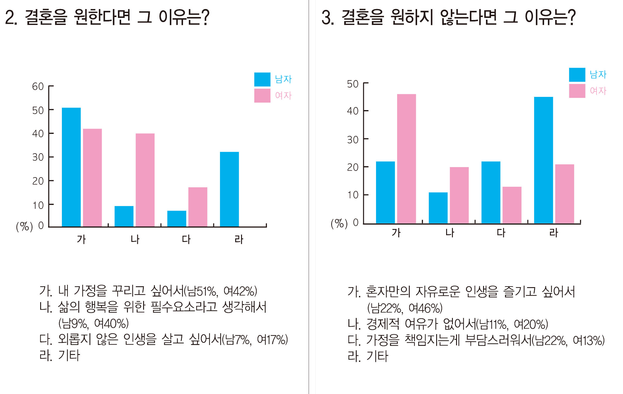 반면에 결혼을 원하지 않는 사람은 100명 중 24명(남자 9명, 여자 15명)에 그쳤다. ‘혼자만의 자유로운 인생을 즐기고 싶어서’라고 이유를 밝힌 사람이 여자 약 46%(7명), 남자 18%(9명)으로 가장 많은 비율을 차지했다. 그 다음으로는 ‘가정을 책임지는 것이 부담스럽다’라는 답변이 남자 약 22%(2명), 여자 약 13%(2명)으로 두 번째로 많았으며, ‘경제적 여유가 없어서’라고 답한 사람이 여자 약 20%(3명), 남자 약 11%(1명)인 것으로 나타났다. 이번 설문조사 결과, 답변자 중 결혼을 원하지 않는 사람들 대부분이 가정을 꾸리는 데에 필요한 책임 또는 경제적 능력에 어느 정도 부담을 느끼고 있음을 알 수 있었다.