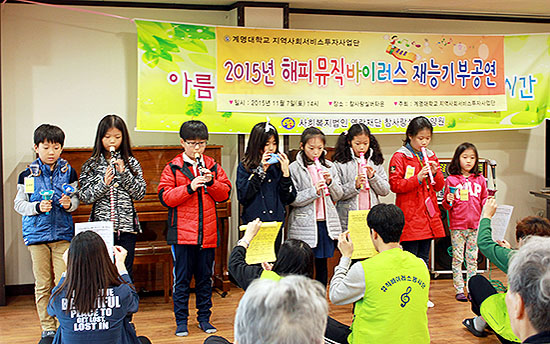 지난 7일 우리학교 지역사회서비스투자사업단이 대구 참사랑실버타운에서 ‘제5회 뮤직바이러스 사업 재능기부 공연’을 열었다. 이날 행사는 지역사회서비스투자사업단 뮤직바이러스 사업대상 아동 30여명이 참여해 다양한 재능기부 공연을 펼쳤다.