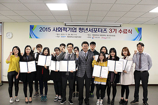 지난 11월 23일 대명캠 동산관 805호에서 우리학교 창업지원단이 주관한 ‘사회적기업 청년서포터즈 3기 수료식’이 열렸다. 서포터즈 활동을 수료한 학생 15명은 지난 3개월 동안 사회적기업 지원을 목표로 관련 행사 및 봉사활동, 사회적기업 탐방 등의 활동을 펼쳤다.