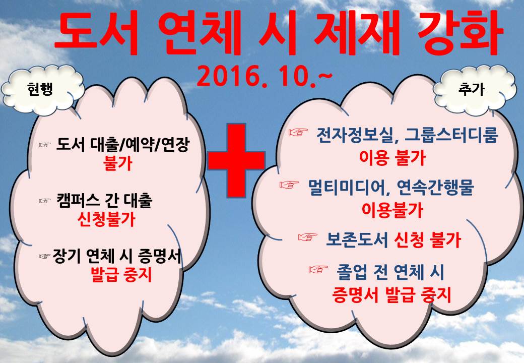 동산도서관이 10월 1일부터 도서 및 멀티미디어자료 연체 시 제재를 강화했다. 이에 따라 도서관 자료를 연체할 경우에는 도서 대출 및 증명서 발급 중지 등 기존의 제재에 더해 전자정보실, 그룹스터디룸 이용에도 제재가 가해지며, 멀티미디어와 연속간행물 또한 이용을 제재한다. 이외에도 보존도서 신청 불가, 졸업 전 연체 시 증명서 발급 중지 등의 조항이 추가로 신설되어 도서 회수율이 높아질 전망이다. 강화된 제재 조치는 도서관의 반복된 반납권고에도 불구하고 도서를 반납하지 않은 이용자에 한하여 적용된다.