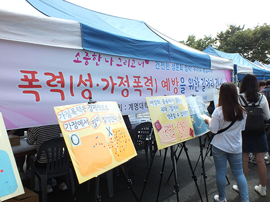 26일에 열린 ‘찾아가는 성폭력 예방교육’에서는 교육, 모둠 토의 등의 활동이 진행됐다. 또한 27일 열린 ‘폭력예방을 위한 길거리 전시’에서는 성폭력 예방 홍보물 전시와 성지식 OX퀴즈, 생리주기 팔찌 만들기 등을 진행했다.