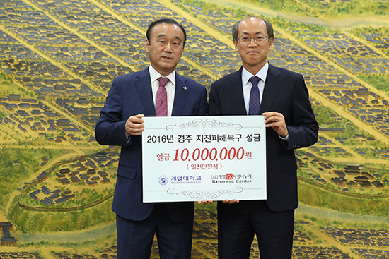 우리학교 (사)1%사랑나누기에서는 지난 10일 울산사회복지공동모금회에, 김용일(철학윤리학·교수) 학생부총장 등은 지난 11일 경주시를 방문해 각각 1천만원씩 전달했다. 이번 성금전달은 각각 태풍 ‘차바’로 피해를 입은 울산지역과 최근 잦은 지진으로 피해를 입은 경주지역의 수해복구에 보탬이 되고자 이루어졌다.