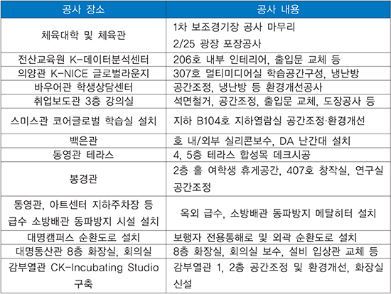 방학동안 학생들의 복지향상과 교육환경 개선을 위해 교내 노후 시설 개·보수가 진행됐다. 이번 방학에는 의양관 307호 멀티미디어실 학습공간 구성과 바우어관 학생 상담센터 공간조정, 대명캠퍼스 순환도로 설치공사 등 총 13곳에서 교육환경개선공사가 실시됐다.
