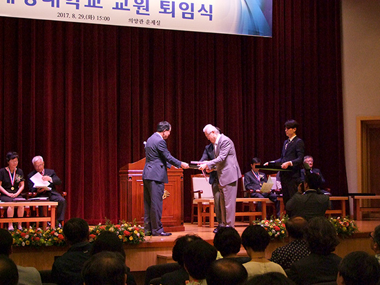 같은 날 의양관 운제실에서는 ‘2017학년도 1학기 교원 퇴임식’이 열렸다. 교원 퇴임식은 퇴임교원 소개, 정부 훈·포장 전달 및 공로상 수여, 퇴임사 등의 순서로 진행됐다. 퇴임교원을 대표해 강영욱(수학) 교수는 “우리학교의 이러한 성장과 발전은 구성원들의 헌신적 희생과 노력 덕분에 가능했다.”며 “교수로 재직하던 시절은 축복받은 시간이었고, 결코 짧지 않은 시간이었다.”고 소회를 전했다.