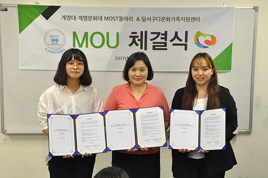 다문화 교류 동아리인 우리학교 동아리MOST가 지난 9월 13일 산학협력센터에서 계명문화대 MOST 동아리, 달서구다문화가족지원센터와 다문화 관련 교류 및 협력관계를 구축하기 위한 협약을 체결했다. 이날 김성숙(소비자정보학·교수) 센터장은 “학생들이 나서서 다문화 가정을 위해 자원봉사를 해주는 것에 대해 고맙고, MOST 동아리가 이를 계기로 더욱 발전하기를 기대한다.”라고 말했다.