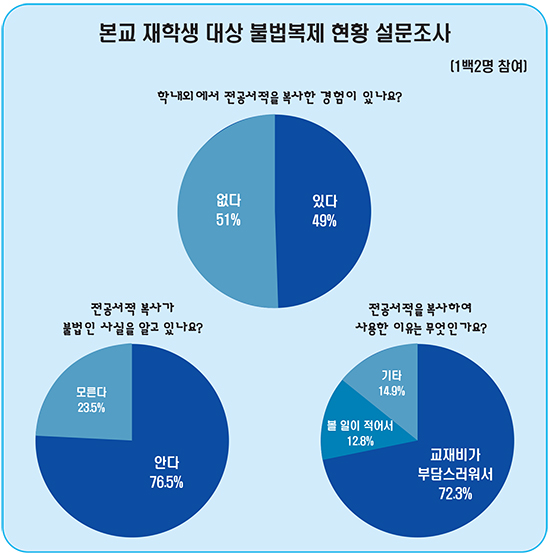 학생들의 대부분이 불법복제가 위법행위라는 점을 인지하고 있음에도 이를 포기하지 못하는 이유는 ‘교재비가 부담스러워서’가 72.3%로 압도적이었고, ‘쓸 일이 없을 것 같아서’가 12.8%, ‘기타’가 14.9%로 뒤를 이었다.