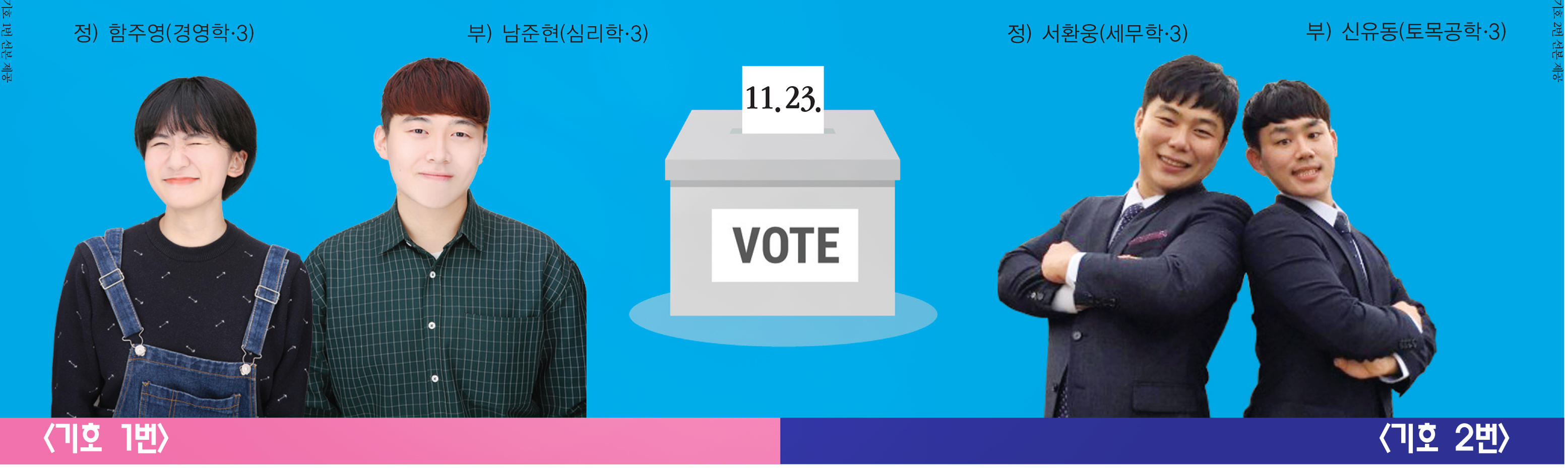 남 : 출마 전부터 ‘즐겁게 하고 싶다’라는 생각을 많이 했다. 결과가 어떻게 나오든 끝날 때도 웃으면서 끝내고 싶다. 총학생회는 되게 거창해 보인다. 저도 그렇게 느꼈다. 그만큼 총학생회가 학생들과 거리가 멀다는 반증이다. 그런데 우리는 별로 대단한 사람이 아니다. 평범한 사람들도 도전할 수 있다는 것을 학우 분들도 알아주셨으면 하는 바람이다.