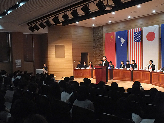 지난 14일, 인문국제학대학 국제지역학부가 주최한 ‘2017년 제8회 모의 국제회의’가 스미스관 100호에서 ‘북한의 핵개발 문제에 대한 각국의 대응’이라는 주제로 열렸다. 행사는 국제지역학부 교수 및 학생 등이 참석한 가운데 개회식, 국가별 기조연설, 라운드테이블, 발표 시상식 순으로 진행됐다. 개회식에서 이병로(일본학·교수) 인문국제학대학장은 “이번 모의국제회의는 북한의 핵개발 문제가 국제적으로 심각해지고 있는 상황에서, 한국이 나아갈 대안은 무엇인지에 대해 모두가 고민하는 계기가 될 것이다. 준비를 위해 수고해주신 많은 교수님들과 학생들에게 깊은 감사를 드린다.”고 했다.