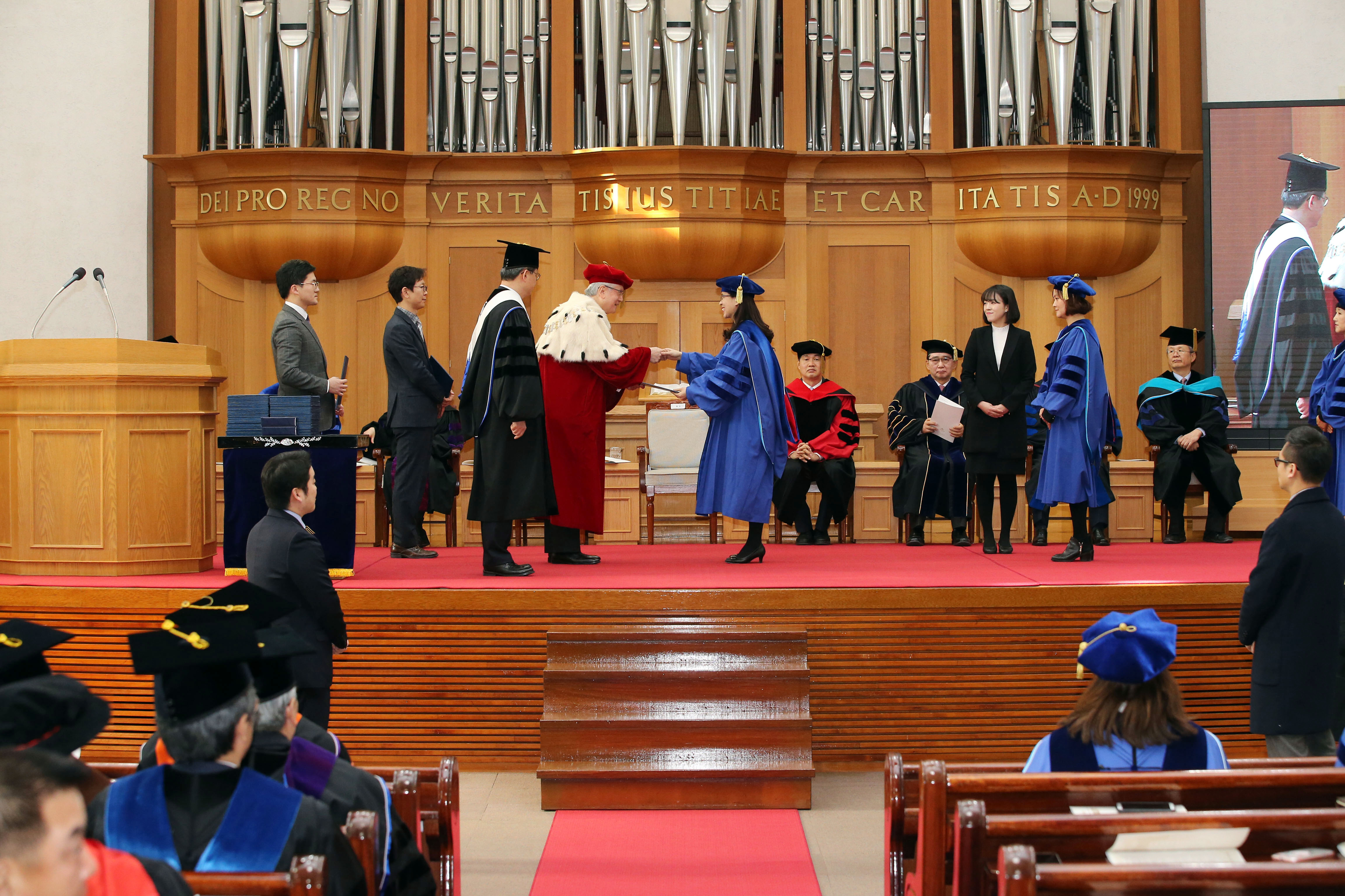 2017 학위수여식 우리학교를 졸업한 3천8백40명이 졸업장을 수여받았다. 또한 대학원은 지난해 8월 졸업생과 이번 졸업생 모두 합해서 8백77명(박사 1백8명, 석사 7백19명, 비학위과정 50명)에게 학위를 수여했다. 사진은 2월 13일에 아담스채플에서 열린 ‘대학원 학위수여식’에서 졸업생이 신일희 총장으로부터 학위증을 수여받는 모습.