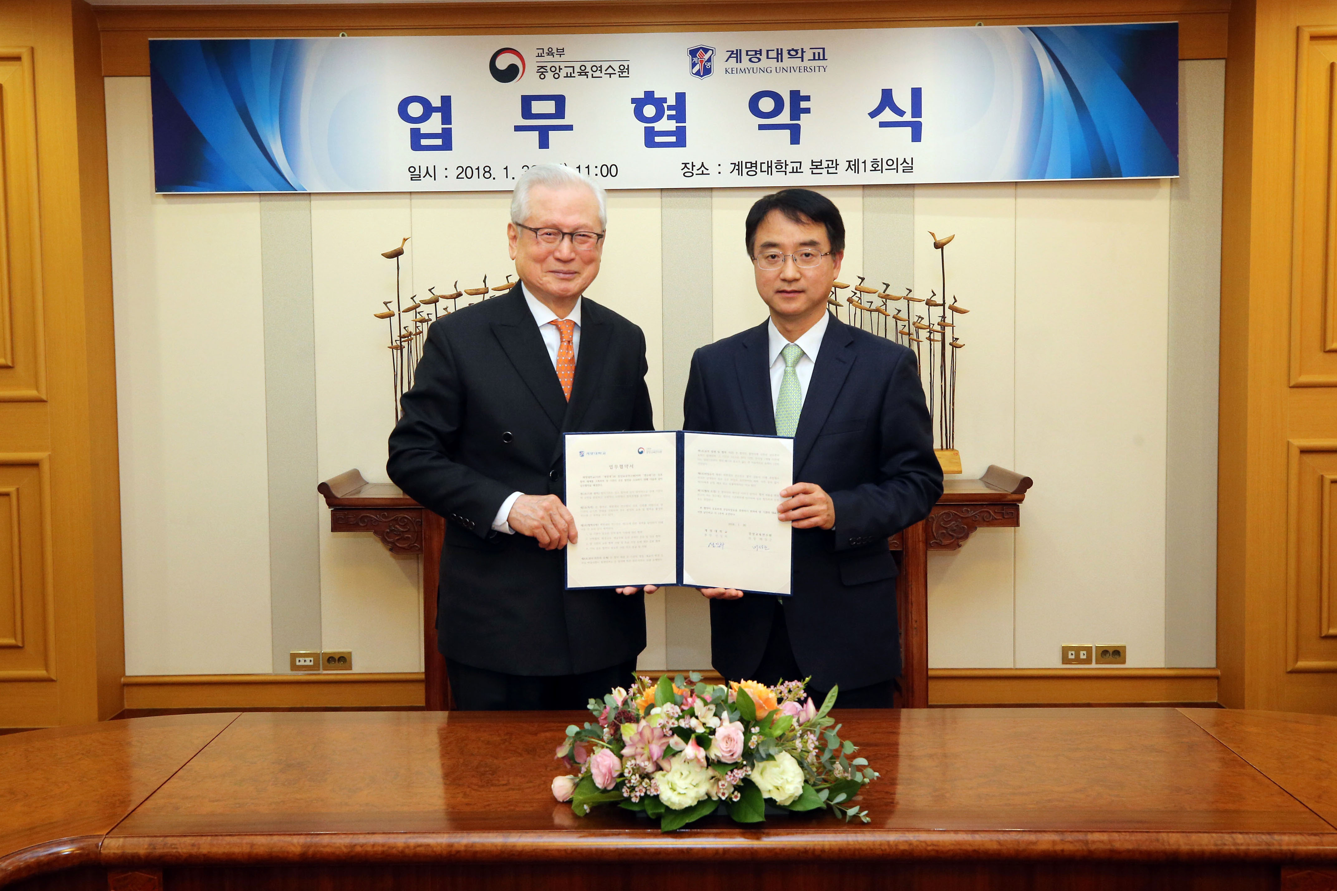 지난 1월 31일 본관 제1회의실에서 우리학교와 교육부 중앙교육연수원이 상호 협력체계 구축을 위한 협약을 체결했다. 협약식에는 신일희 총장과 배성근 중앙교육연수원장을 비롯한 관계자 20여 명이 참석했다.