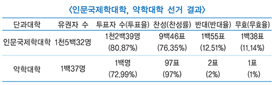 인문국제학대학 학생회장 선거는 총 유권자 1천5백32명 중 1천2백39명이 투표하여 80.87%의 투표율을 기록한 가운데 정재준 후보가 찬성 9백46표(76.35%), 반대 1백55표(12.51%), 무표 1백38표(11.14%)를 얻으면서 당선됐다. 약학대학 학생회장 선거는 총 유권자 1백37명 중 1백명이 투표하여 72.99%의 투표율을 기록한 가운데 이주형 후보가 찬성 97표(97%), 반대 2표(2%), 무표 1표(1%)를 얻으면서 당선되었다.