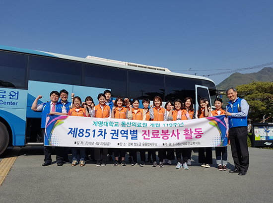 우리학교 동산병원이 지난달 20일에 경북 청도군 운문면을 찾아 ‘사랑 실은 건강 천사’ 의료봉사를 펼쳤다. 영상의학과와 마취통증의학과를 비롯한 총 9개의 부서가 참여하여 운문면 어르신들을 대상으로 갑상선・복부 초음파 및 각종 통증 검사 등을 실시했다. 한편, 동산병원은 지난 2013년부터 국민건강보험공단과 함께 의료봉사를 통해 저소득층의 의료사각지대 해소를 위한 사회공헌활동을 하고 있다.