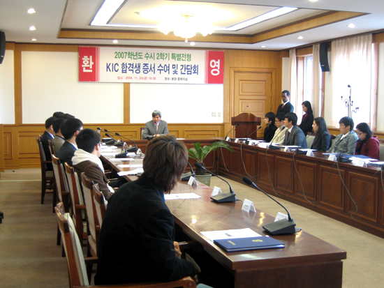 본관 중회의실에서 열린 증서수여 및 간담회에는 수시 2학기 특별전형 KIC 합격생 15여 명과 학부모 20여 명이 참석한 가운데 이진우 총장이 KIC 합격생과 학부모들에게 “KIC는 세계적인 석학인 이상문 교수와 Willam A. Snow 교수를 명예학장과 학장으로 임용했고 지금도 외국의 뛰어난 교수를 초빙하기 위해 노력 중이다”고 말해 KIC가 기존의 단과대학과는 차별화됨을 강조했다.