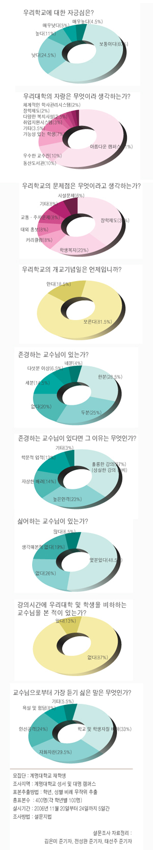 우리대학은 지난 2004년부터 K-up프로젝트에 박차를 가하는 등 경쟁력을 높이기 위해 다각도로 노력하고 있다. 이러한 바탕 아래 본사에서는 우리대학의 경쟁력을 확보하기 위한 가장 중요한 요소인 학교구성원들의 학교에 대한 자긍심과 인지도를 알아보고자 설문조사를 실시하였다. 또한 학생들이 느끼는 학교의 보완해야 할 점과 우리대학 교수 및 강의에 대한 생각을 알아보았다. |