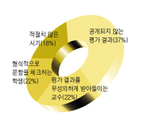 ‘공개되지 않는 평가 결과’가 37%로 가장 높았고, ‘평가 결과를 무성의하게 받아들이는 교수’와 ‘성적 확인을 위해 형식적으로 문항을 체크하는 학생’이 각각 22%, ‘강의 평가서의 적절치 않은 시기성’이 18%로 나타났다.