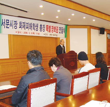 지난 연말 서문시장 화재 사고 후, 우리대학은 대책회의를 갖고 1월 6일부터 2월 7일까지 1 · 2차에 걸쳐 피해 장학금을 신청 받아 확인절차를 밟아 특별장학금을 지급하게 됐다.