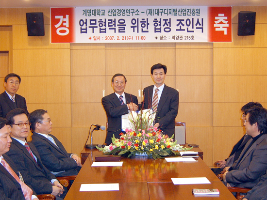 우리대학 산업경영연구소(소장 이병찬)는 (재)대구디지털산업진흥원(원장 박광진)과 21일(수) 11시, 의양관에서 IT, CT 벤처기업의 경쟁력 강화와 성장발전에 기여할 목적으로 상호교류 협정을 체결했다.