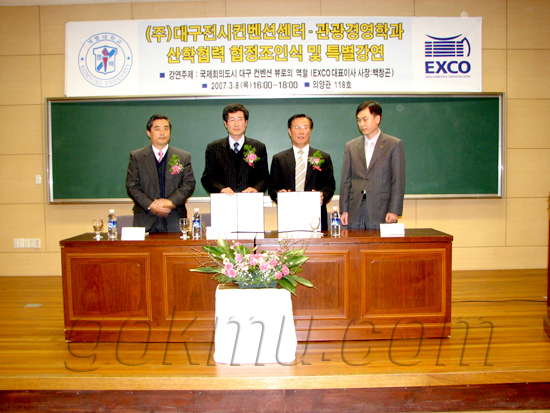 실무경험의 기회를 제공해 취업경쟁력을 높이겠다는 취지 하에 관광경영학과·EXCO 산학협력 협정조인식 및 특별강연이 지난 8일 의양관 118호에서 열렸다.