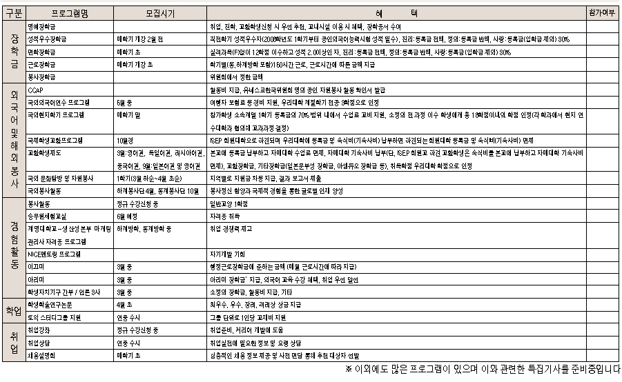 2007학년도 우리대학의 등록금 인상률은 6.4%이다. 2006년과 비교해서 0.3%가 낮아졌지만 등록금 인상의 고공행진은 멈추지 않을 추세다. 이미 등록금을 납부하고 등록한 이상 불평, 불만보다는 하나 둘 챙겨가면서 등록금 환원율을 높이는 것은 어떨까? 아래에 있는 표는 우리대학 학생이면 누구나 참여할 수 있는 프로그램과 혜택들을 요약한 것이다. 자신에게 해당하는 곳에 체크해보며 부모님이 마련해주신 등록금을 알뜰하게 챙겨가고 있는지 알아보자.※ 이외에도 많은 프로그램이 있으며 이와 관련한 특집기사를 준비중입니다.