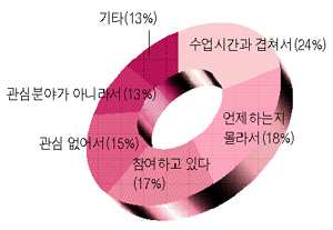 총 1백51명의 의견을 들은 결과 ‘수업 시간과 겹쳐서’가 24%로 가장 많았고, ‘언제 하는지 몰라서’ 18%, ‘참여하고 있다’ 17%, ‘관심 없어서’ 15%, ‘관심분야가 아니라서’와 ‘기타’가 각각 13%로 나타났다.