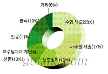 총 1백10명의 의견을 들은 결과, ‘수업태도(발표, 질의 등)’가 28%로 가장 많았고, ‘과제물 제출’이 17%, ‘노트필기’ 15%, ‘교수님과의 개인적 친분’ 13%, ‘전공(본인 전공, 타전공)’ 11%, ‘출석’ 10%, ‘기타’ 6%로 나타났다.