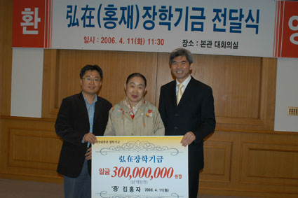 ‘홍재 장학기금’은 42년간 교직생활을 한 김홍자 씨가 퇴직금 3억 원을 기부해 만든 장학기금으로, 김홍자씨의 두 자녀가 졸업한 우리대학 미술대학의 재학생 중 미술대회에서 우수한 성적을 거둔 학생을 선발해 전달할 예정이다.