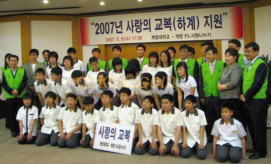 우리대학 계명 1% 사랑나누기가 지역사회에 사랑을 베풀고 어려운 이웃을 돕자는 취지로 지난 9일 ‘2007년 사랑의 교복(하계)지원’행사를 열어 성서 지역 41명의 저소득 가정 중·고등학생들에게 교복을 제공했다.