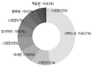 총 1백30명의 의견을 들은 결과 ‘대학 소식 기사’가 47%로 가장 많았고, ‘고정란2(뒤통수, 신당동 1000번지, 계명의 눈, 계명 만평, 기자 칼럼, kmu 리서치, kmu-quiz)’가 11%, ‘시사면 기사’와 ‘고정란3(비사광장, 계명인, 타대에서 배운다)’ 8%, ‘발자취면 기사’, ‘고정란1(김상기 칼럼, 사설, 와룡골이야기, 문다헌에서, 교수님 추천해 주세요, 국어능력시험, 도서관 신착도서, 취업포인트, 주간식단)’ 7%, ‘문화면 기사’와 ‘학술면 기사’, ‘고정란4(미디어 평론, 홍영철의 푸른 편지)’가 각각 5%, 4%, 3%로 집계돼 학생들이 학교와 관련된 기사에 많은 관심을 보인다는 것을 알 수 있었다.