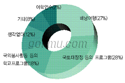 총 1백19명의 의견을 들은 결과 ‘국토대장정 등의 프로그램’이 28%로 가장 많았고, 다음으로 ‘배낭여행’이 27%, ‘국외봉사활동 등의 학교 프로그램’이 18%, ‘생각없다’가 12%, ‘기타’가 8%, ‘어학연수’가 7%인 것으로 나타났다.