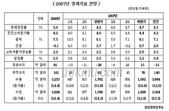 기반한 완만한 성장세가 예상된다. 세계 IT경기 호황기의 수출주도나 신용카드 버블기의 소비주도와는 달리 수출이 10%대의 증가세를 유지하는 가운데 내수가 회복되는 균형적인 양상이다. 2007년의 한국경제는 미국경제의 경착륙, 고유가, 국내 부동산경기 급락과 가계부실 등의 리스크 요인들이 있다. 그러나 이러한 문제들이 너무 악화되지만 않는다면 하반기 중 성장세를 확대해 나갈 수 있을 것으로 보인다. 이처럼 경기의 흐름은 점차 개선되는 모습을 보이면서 2007년 한국경제는 하반기 4.7%, 연간 4.5%의 경제성장을 달성할 전망이다.