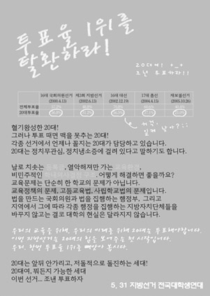 이번 지방선거에 대해 5.31 지방선거 전국대학생연대 이대원(고려대·4) 집행위원장은 “지난 2002년 6월 13일 열린 지방선거의 총 투표율 48.9%였던데 반해 20대의 투표율이 31.2%에 그쳤으며 2004년에 열린 제17대 총선의 연령별 투표율에서도 20대가 가장 낮은 투표율을 보였다. 이번 선거에서는 전체 투표율을 45~50% 정도로 예상하고 있으며, 대학생의 투표율이 전체 평균 투표율에 도달하는 것을 목표로 하고 있다”고 밝혔다. 또한 “이렇게 대학생들의 참여가 저조한 것은 우리나라의 짧은 정치연혁과 제도권 교육에 원인이 있다”고 주장했다.