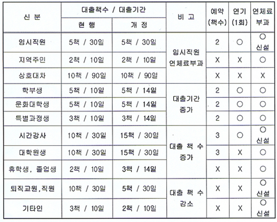 도서연체에 대한 제재 방법으로 연체료 납부 및 대출중지 두 가지 중 연체료의 경우 기존 연체료의 가격이 1일 1책 당 50원에서 100원으로 올라가며 대출중지의 경우 1일 1책 연체 시 1일 대출중지가 된다. 현재 문화대학 조교를 제외한 조교는 대학원생으로 통합되며 9월 1일부터 임시직원·퇴직교직원·기타인·시간강사는 도서 연체 시 연체료가 부과된다.
