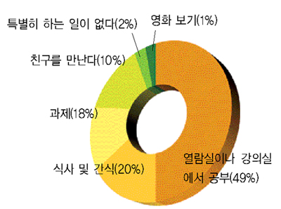 총 1백72명의 의견을 들은 결과 ‘열람실이나 강의실 등에서 공부(독서)’가 49%로 가장 많은 비율을 차지했다. 다음으로 ‘식사 및 간식’이 20%, ‘과제’가18%, ‘친구를 만난다’가 10%, ‘특별히 하는 일이 없다(잠자기)’가 2%, ‘영화보기’가 1% 순으로 나타났다.