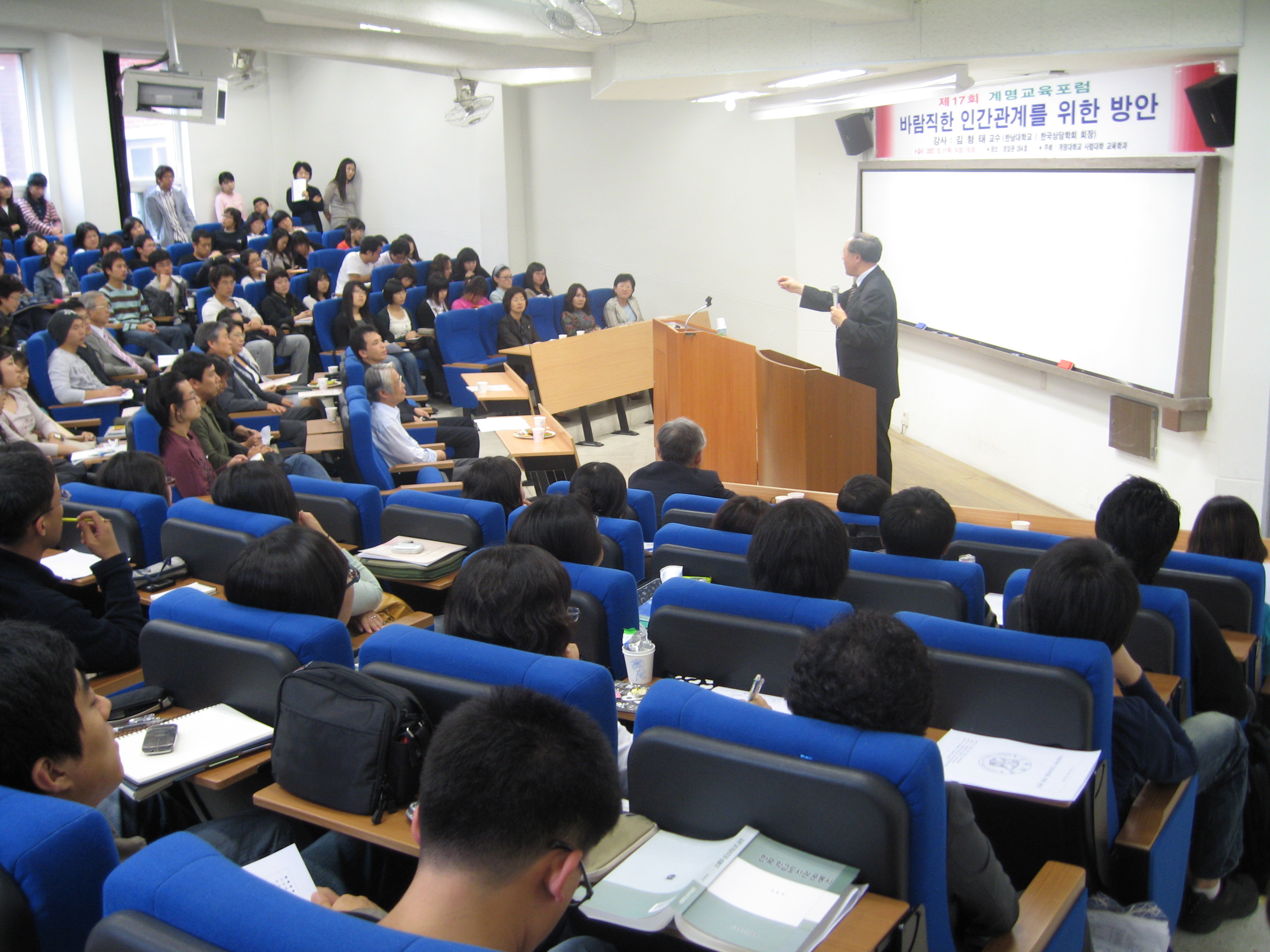 강연을 맡은 김형태(한국상담학회·회장·한남대 교육학·교수)교수는 “바람직한 인간관계 형성이 중요한 이유는 지인들과의 관계로 삶의 행복과 불행이 나뉘기 때문이다”고 말하며 바람직한 인간관계를 형성하기 위한 방법으로 배려, 용서, 아량 등을 꼽았다.
