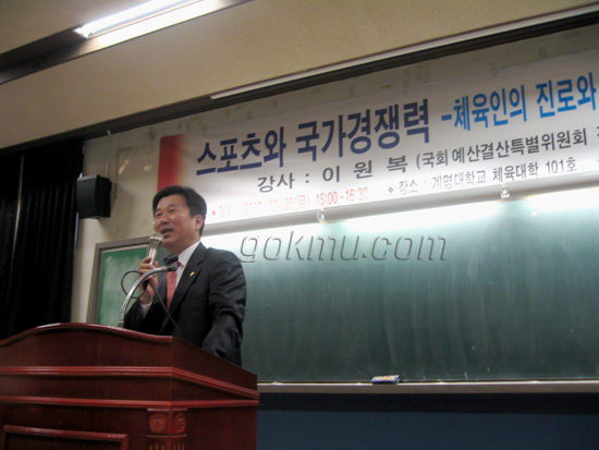 2백여 명의 학생들이 참석한 가운데 진행된 이번 특강은 국회 예산 결산 특별 위원회 이원복 간사가 강연을 맡아 체육인의 진로와 체육의 사회 기여도에 대해 설명했다.