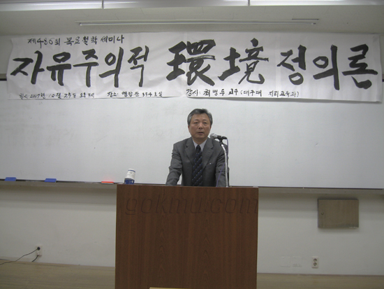 이번 강연은 최병두(대구대 지리교육·교수)교수를 초청해 생태계문제를 철학적·윤리적 입장에서 접근했다. 최병두 교수는 “인간이 자연의 내재적 가치를 인정하지 않고 자연을 보존하는 것은 불가능하다”며 환경문제들을 사회공적 문제로 이해하고 해결해야한다고 주장했다.