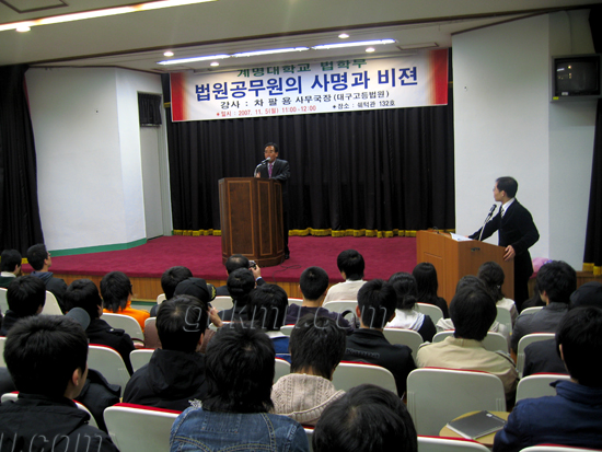 지난 5일 대구고등법원 차팔용 사무국장을 초청한 취업특강이 ‘법원공무원의 사명과 취업’이라는 주제로 열렸다. 차팔용 사무국장은 법원과 검찰의 차이과 함께 “법원직 공무원은 7급 이상이면 직원 개개인이 독립된 관청으로서 역할을 할 수 있다”고 말했다.