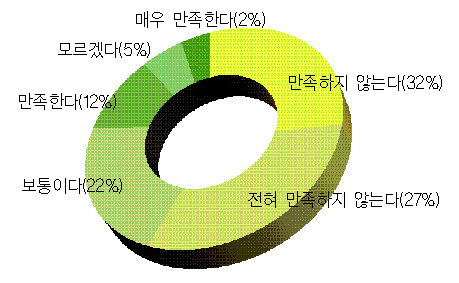 총 1백41명의 의견을 들은 결과 ‘만족하지 않는다’가 32%로 가장 높게 나타났고 ‘전혀 만족하지 않는다’가 27%, ‘보통이다’가 22%, ‘만족한다’가 12%, ‘모르겠다’가 5%, 그리고 ‘매우 만족한다’가 2%로 나타났다.