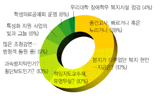 총 1백 47명의 의견을 들은 결과 ‘중간고사, 빠르거나 혹은 느리거나’가 28%로 가장 많았으며 ‘책임지도교수제, 유명무실?’과 ‘본지가 다루었던 복지현안…지금은?’이 각각 17%, 그리고 ‘바우어관 앞 도로 시설물 - 과속방지턱인가?’가 13%로 나타났다.