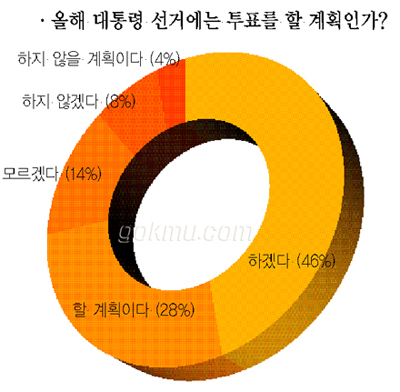 올해 대통령 선거에 투표권을 가진 만 19세 이상 유권자의 수는 3백75만 4천7백51명이다. (2007년 2월 28일 기준) 투표권을 행사할 수 있는 세대들 중 유난히 20대는 정치적 참여가 저조하다는 평을 받고 있다.