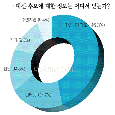 ‘대선 후보에 대한 정보는 어디서 얻는가?’라는 질문에 ‘TV·라디오’가 46.3%로 가장 많았다. 뒤를 이어 ‘인터넷’이 24.7%, ‘신문’이 14.3%, ‘기타’와 ‘주변지인’이 각 9.3%, 5.4%로 나타났다.