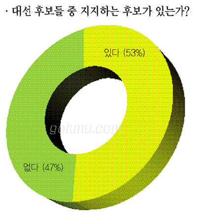 또한, ‘올해 실시되는 제 17대 대통령 선거일을 알고 있는가?’라는 질문에 응답자 중 85%의 학생이 ‘알고 있다’고 답해 대선에도 관심이 많은 것으로 나타났다. 반면 ‘이번 대통령선거에 몇 명의 후보가 출마하는지 알고 있는가?’라는 질문에는 61%의 학생이 ‘알고 있다’고 답해 선거일은 알고 있음에도 불구하고 대선 후보자가 몇 명인지는 정확히 모르는 학생들이 있었다.