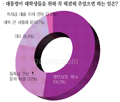 또한 ‘이번에 당선될 대통령이 대학생들을 위해 꼭 해결해 주었으면 하는 일은?’이라는 질문에 응답자 중 59.3%가 ‘청년실업 해소’를 꼽았다. 이는 이태백(이십대 태반이 백수)이라는 말이 정형화된 요즘 시대가 반영된 결과로 보인다. 다음으로는 ‘등록금 인상 문제 해결’이 22%, ‘대학 간 서열화 문제’가 7%, ‘학자금 대출 이자 인하’가 3.3%로 나타났다. 8.4%를 차지한 기타의견에는 ‘군복무 기간 축소’, ‘대학교육 내실화’, ‘비정규직 문제 해결’ 등이 있었다.■ D-16, 소중한 한 표, 내 권리.