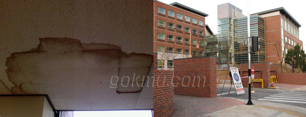 좌측은 우리대학 동산도서관의 열람실 천장이며 우측은 완공되어 가는 국제교류센터와 새롭게 만들어진 남문의 모습입니다. 학생의 편의와 학교의 발전을 위해 노력하는 모습은 보기 좋지만 새로운 것만을 늘리기보다 기존의 것들도 점검해 보는 것이 어떨까요?