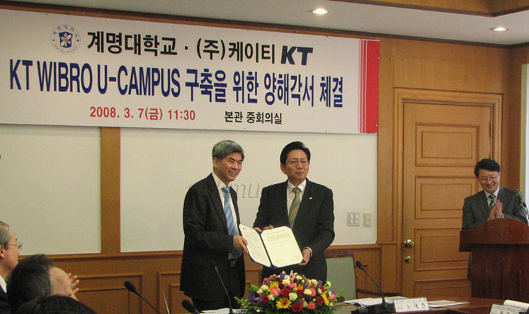 지난 7일 우리대학과 KT가 본관 중회의실에서 KT WiBro U-캠퍼스 구축을 위한 양해각서를 체결했다. 우리대학은 지난 2007년 3월부터 KT에 서비스를 요청했고, 2008년 1월에 구체적인 협의를 통해 캠퍼스 전역에 관련 설비와 시험가동을 마친 상태다. 이로써 3월부터 WiBro존이 구축되고 앞으로 캠퍼스 전역에서 무선인터넷을 자유롭게 사용할 수 있다.